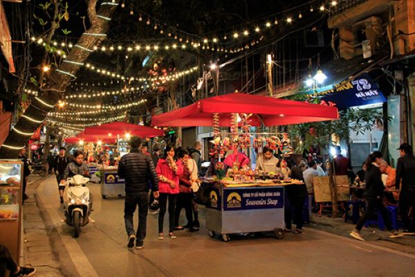 Nestled in Hanoi Old Quarter, the Hanoi Old Quarter Night Market is arguably the most famous among Hanoi night markets. Just a short walk from Hoan Kiem Lake, it thrives in a densely populated area rich with history. Open every weekend from 6 pm to midnight, the market stretches along Hang Dao Street, buzzing with activity. The market boasts a variety of goods, including clothes, salted dried fruits, sweets, stationery, and an abundance of food stalls. Adventurous eaters can dive into local delicacies like Hanoi Pho, Bun Cha, Vietnamese bread, and roasted quail. For first-time visitors, this market is an unmissable introduction to Vietnam’s night market scene.