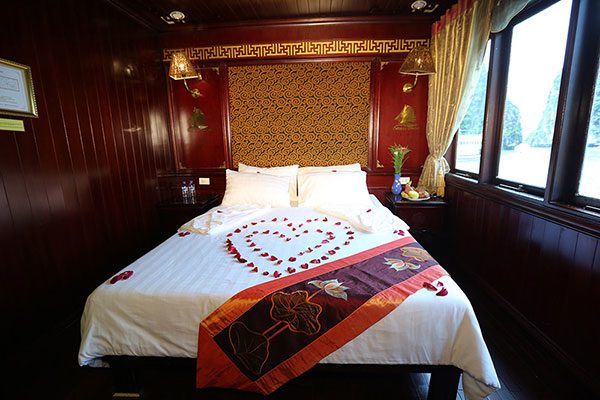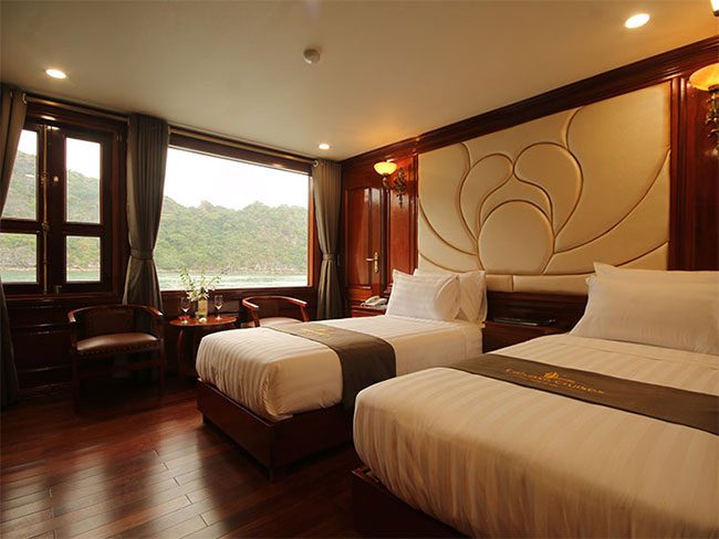 12:15 – 13:00: From Tuan Chau wharf, Tuan Chau island of Ha Long city, we go to Calypso Cruise by small boat. A warmly welcome drinks will be served upon arrival the cruise then has a short time for check in proceeds: get a brief introduction and safety guidelines then check in