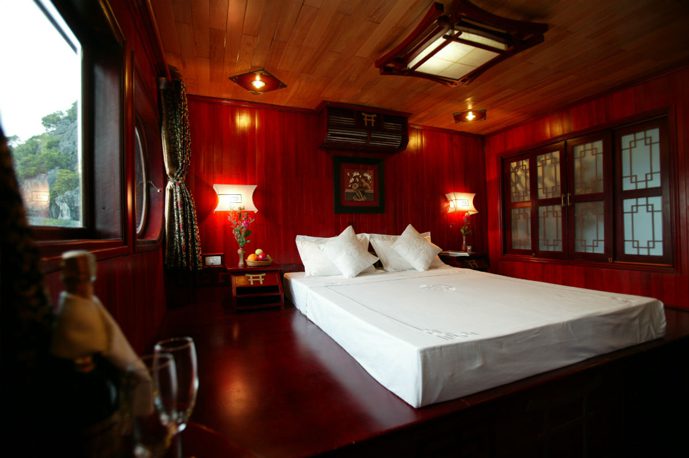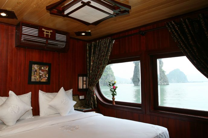 Unlike the larger cruise ships, Prince Junk’s smaller scale ensures a peaceful journey through the bay’s stunning limestone landscapes. Every detail, from teak and oak paneling to handcrafted furnishings, reflects traditional Vietnamese craftsmanship, combining elegance with timeless charm.