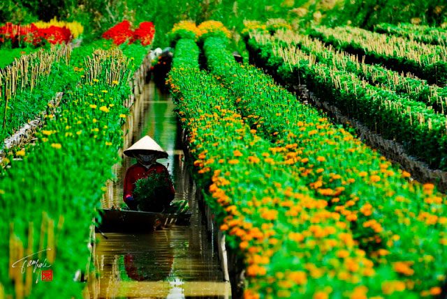 With the convenient location closest to Saigon, My Tho attracts many tourists here to takes pictures and experience the farm life in Vietnam. When the vibrant and irrepressible atmosphere of the coming Lunar New Year is covering everywhere, you will absolutely be stunned with the colorful costume of My Tho Flower Village in Mekong Delta if moving along Highway 50 and coming here. Just like the above flower villages, My Tho is also where various flower species are planted and provided for nearby areas. In this time, travelers will see a busy atmosphere where local farmers taking care, harvesting, and transporting flowers to sell all across the country.