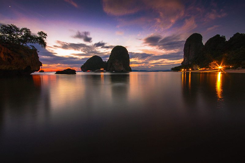 Located on a peninsula, a few minutes by boat from the south of the lively town of Ao Nang, Railay beach seduces bathers with their mangroves, pretty bay and the rocky peaks rising from the water. This beach is only accessible by long tail boat, as it sits on a small peninsula, but it’s worth it. Clear blue water, small islands on the horizon and majestic limestone cliffs surround the small beaches which are usually only crowded during Thailand’s peak season. Here you can participate in interesting activities such as sunbathing, climbing, kayaking and snorkelling.