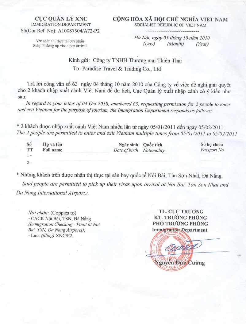 Paradise Travel is registered by Vietnam Immigration Department to apply visa on arrival to Vietnam for foreign tourists.