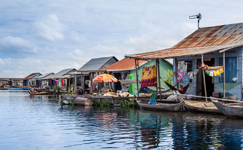 After lunch, we visit the floating village of Moat Khla, accessible only by water, and attend a Buddhist blessing ceremony.