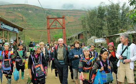 Flower H’Mong, Blue H’Mong, Tu Zi, Tay, Nung and Lo Lo people all converge here bringing life to this sleepy mountain town. 1 hour free after breakfast to explore the market; photographs and shopping; descend from mountain to village on the banks of the Chay River; footpath hike through plum and peach plantations; lunch break on quiet roadside, photograph the scenery – good stretch.