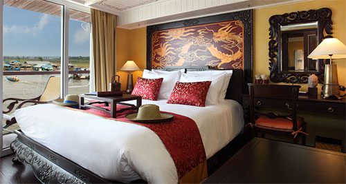 Named after the legendary Cambodian monarch Jayavarman VII, renowned for his serenity and devotion to the arts, the Jayavarman Cruise embodies history, elegance, and culture. Inspired by French-Colonial design and enriched with Khmer touches, the ship’s interior reflects the grandeur of a bygone era. Public spaces are adorned with fine art pieces, creating the ambience of a floating art gallery, while the open kitchen brings a distinctive charm to the onboard culinary experience.
