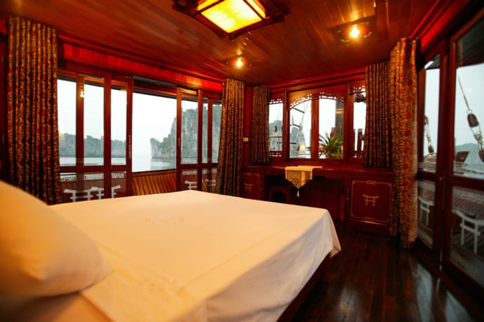 Unlike the larger cruise ships, Prince Junk’s smaller scale ensures a peaceful journey through the bay’s stunning limestone landscapes. Every detail, from teak and oak paneling to handcrafted furnishings, reflects traditional Vietnamese craftsmanship, combining elegance with timeless charm.