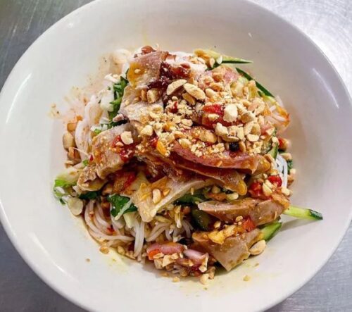 Mi Quang, a specialty of central Vietnam, takes on a refreshing twist at Mi Quang Sua Hong Van with the addition of jellyfish (sua). This unique ingredient adds a slightly crunchy texture to the dish, along with thick rice noodles, flavorful broth, fresh herbs, and peanuts. The dish is served with crispy rice crackers on the side, which are perfect for scooping up every last bit of goodness. At Hong Van, the jellyfish is always fresh, making this spot a must-visit for adventurous food lovers.