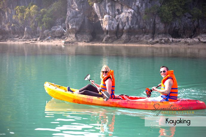 14:45 (Winter activities option 01.11 – 31.03): The cruise stops at Vung Vieng Floating fishing village, a wealthy fishing village and had its reputation for culturing pearls. Here we have time to discover the life and culture of fishing people by kayaking.