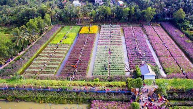 With the convenient location closest to Saigon, My Tho attracts many tourists here to takes pictures and experience the farm life in Vietnam. When the vibrant and irrepressible atmosphere of the coming Lunar New Year is covering everywhere, you will absolutely be stunned with the colorful costume of My Tho Flower Village in Mekong Delta if moving along Highway 50 and coming here. Just like the above flower villages, My Tho is also where various flower species are planted and provided for nearby areas. In this time, travelers will see a busy atmosphere where local farmers taking care, harvesting, and transporting flowers to sell all across the country.