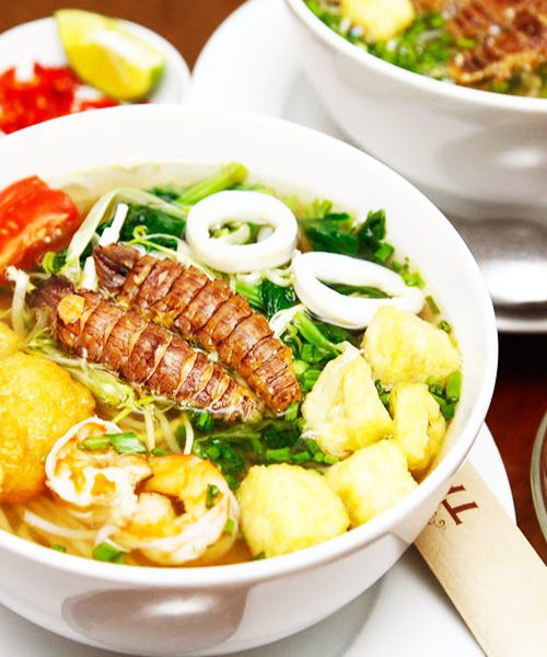 Fresh mantis shrimp vermicelli with green cabbage, naked shrimp, spring onions, dried onions, cilantro, and tomatoes could make you salivate at first sight. Let yourself be tempted by the exquisite taste of the squill or mantis shrimp called “be be”, a shrimp resembling a praying mantis. Such a delight of cuisine!