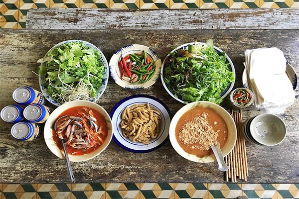 It is a special type of fish salad in the Nam O beach area. The best way to enjoy this dish is to eat fish with many kinds of herbs and vegetables (lettuce, young bananas, cucumber, leaves of basil, fish with mint, etc.). Then roll all the ingredients in rice paper, dip in the fish sauce and enjoy the remarkable taste!