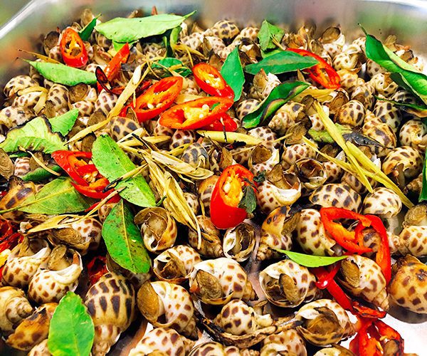 – Snails with a spicy sauce (“Oc Tu Hai Xao Tuong ot”)